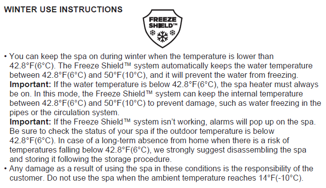 Important:si le système Freeze Shield™ ne fonctionne pas, les alarmes se déclencheront dans le spa. Veillez bien vérifier l’état de votre spa si la température extérieure est inférieure à 6 °C (42,8 °F). En cas d’absence prolongée de votre domicile,